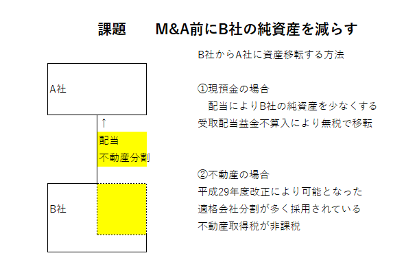 適格会社分割というのがあって、会社を2つに分割して、今回の場合はB社を不動産と事業会社に分割して、分割した不動産をA社に吸収させて、A社をホールディング会社にして、残った事業会社のB社を数年後にM&Aで売却するスキームを組んでみますか?この場合は、不動産は簿価でA社に移転ができます。不動産取得税も非課税です。